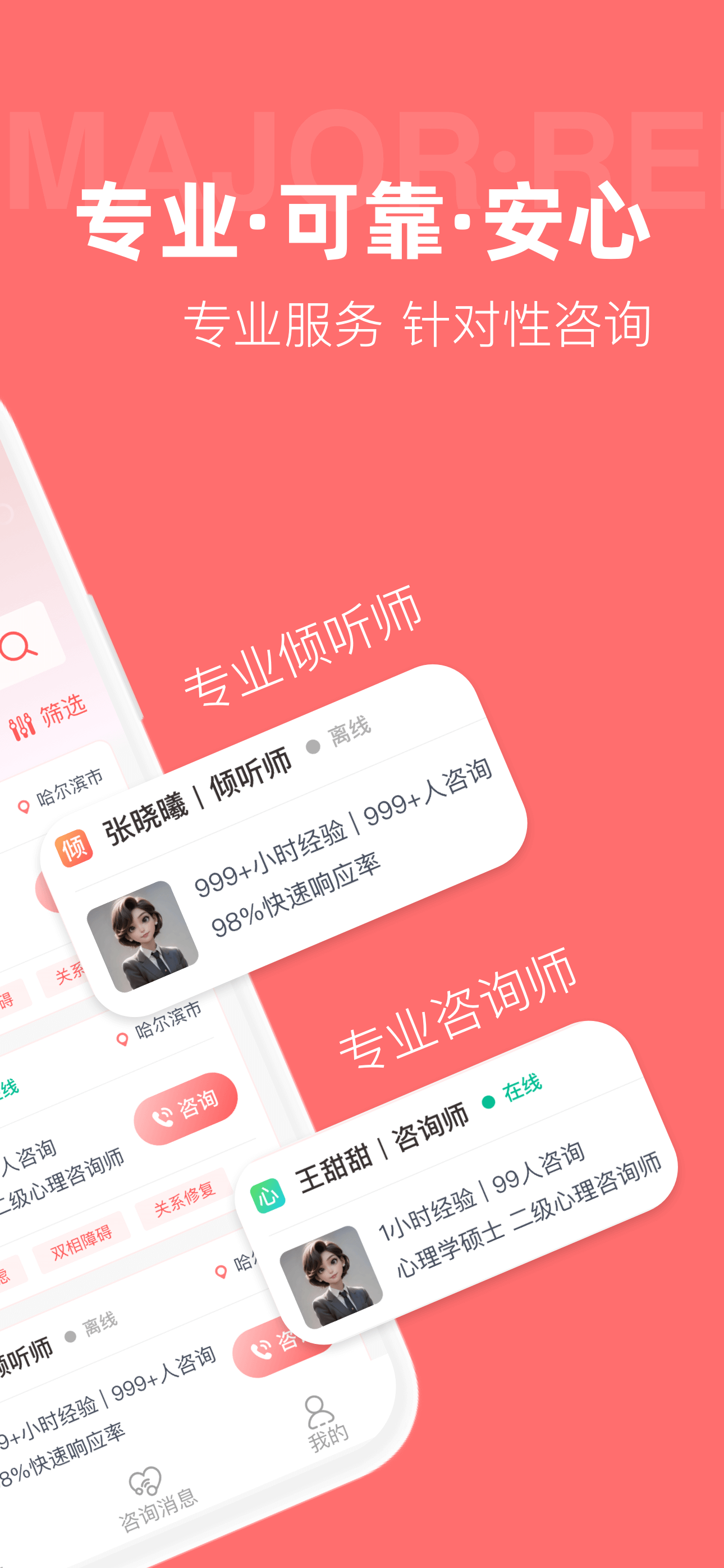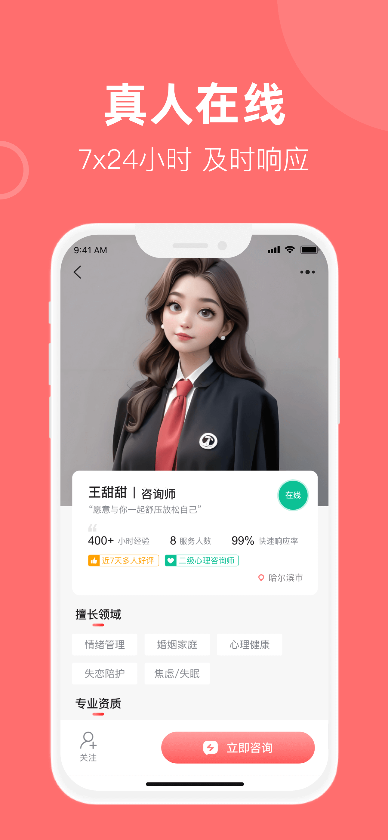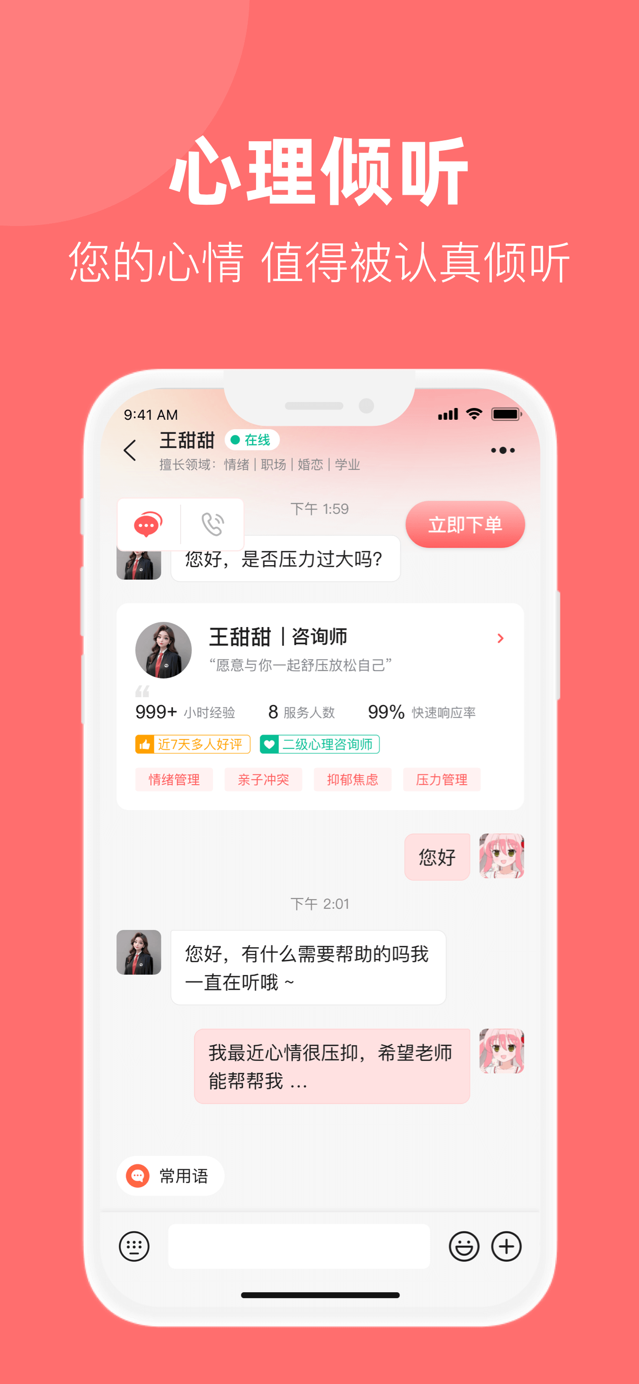 24小时真人在线,和心动的Ta畅所欲言,就像朋友聊天一般倾诉您心中所想,通过专业导师的倾听与陪伴,解压放松,治愈焦虑。